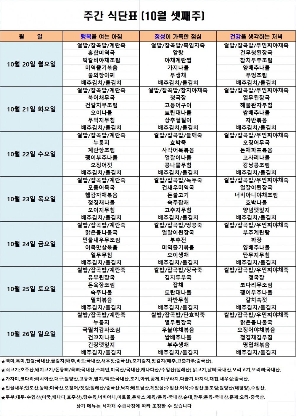 2025.10.20 ~ 2025.10.26 식단표 > 식단표
