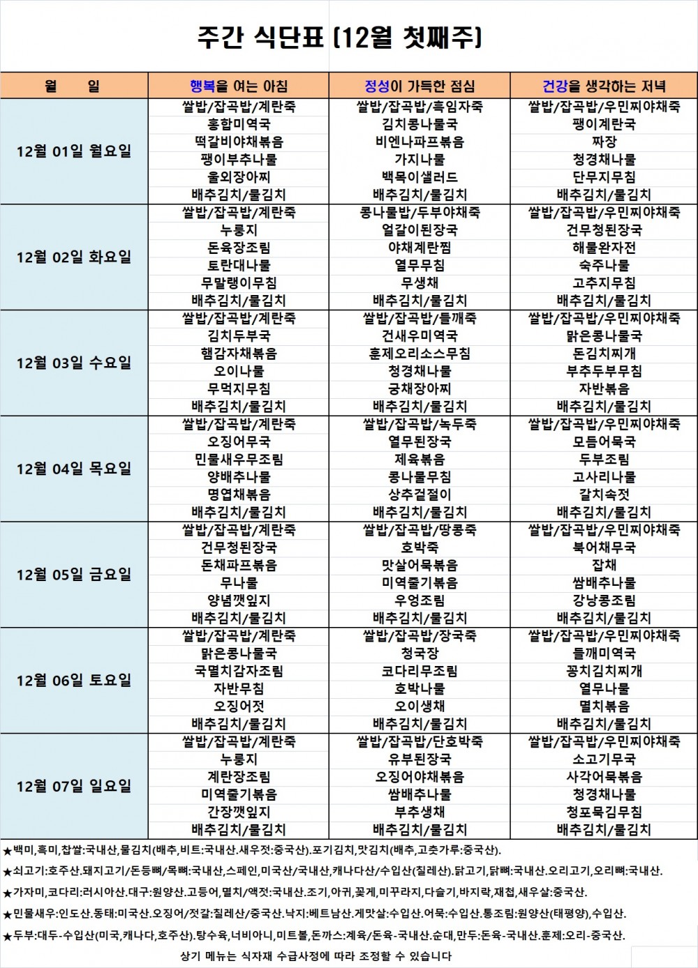 2025.12.01 ~ 2025.12.07 식단표 > 식단표