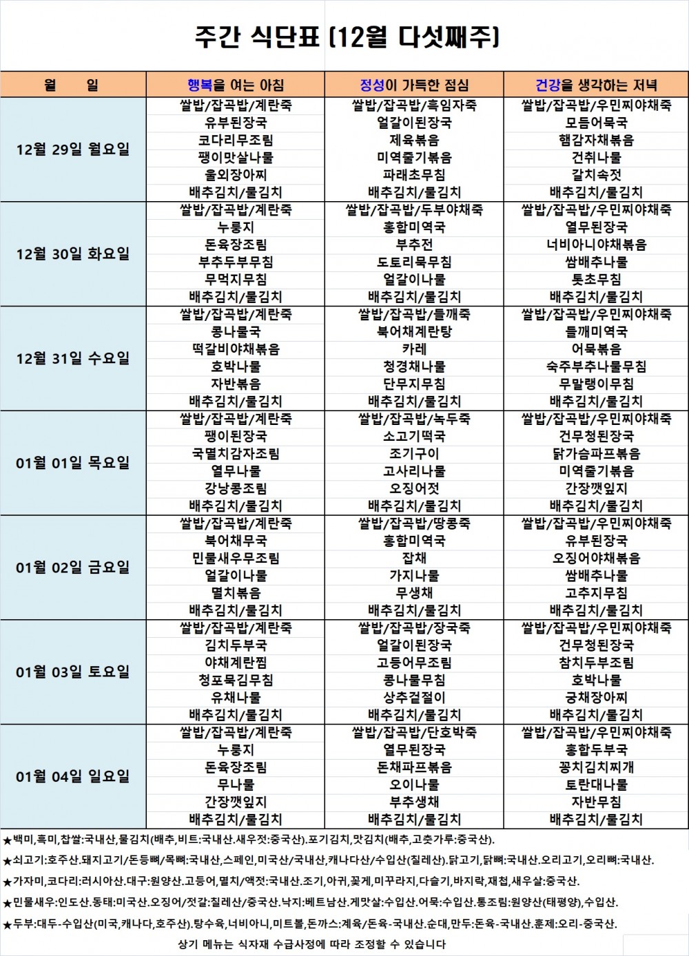 2025.12.29 ~ 2026.01.04 식단표 > 식단표