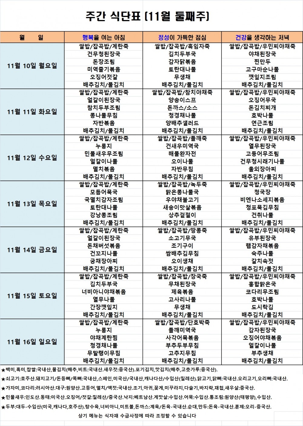 2025.11.10 ~ 2025.11.16 식단표 > 식단표